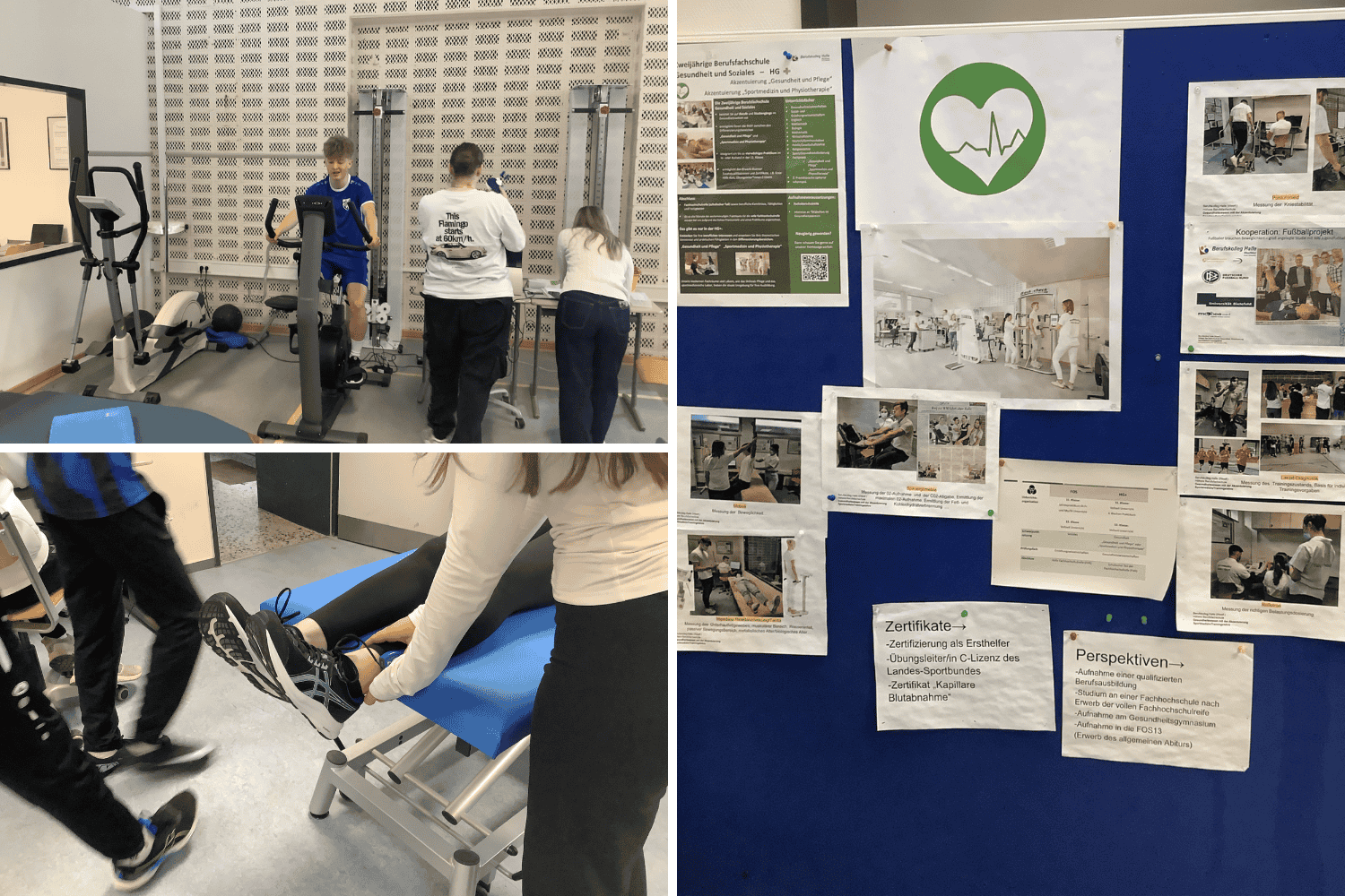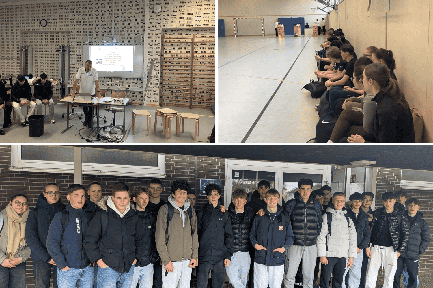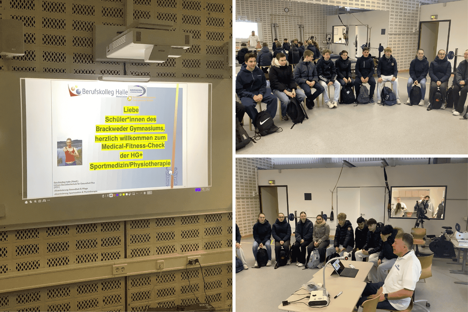 Am Dienstag, den 17. März 2026, sind wir mit unserem Differenzierungskurs „Sport – Mehr als nur Bewegung“ der Jahrgangsstufe 9 zum Berufskolleg nach Halle gefahren. Dort führten (Berufs-)Schülerinnen und -Schüler aus dem Fachbereich „Gesundheit und Soziales“ unter der Leistung des Lehrers Dr. Christian Schürmann eine umfassende sportmedizinische Untersuchung (Medical-Fitness-Check) an uns durch. Ziel war es, verschiedene Leistungsdaten von uns zu messen und eine Aussage über den eigenen aktuellen Leitungs- und Gesundheitsstand zu erhalten. Diese praktische Erfahrung verknüpft die im Theorieunterricht behandelten Themen und kann dazu dienen, individuelle Trainingsempfehlungen zu berücksichtigen.
