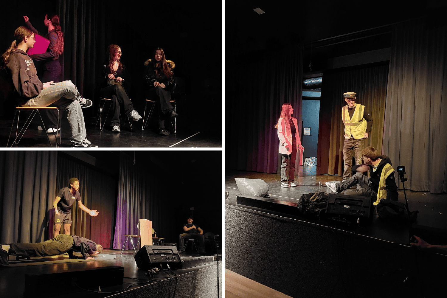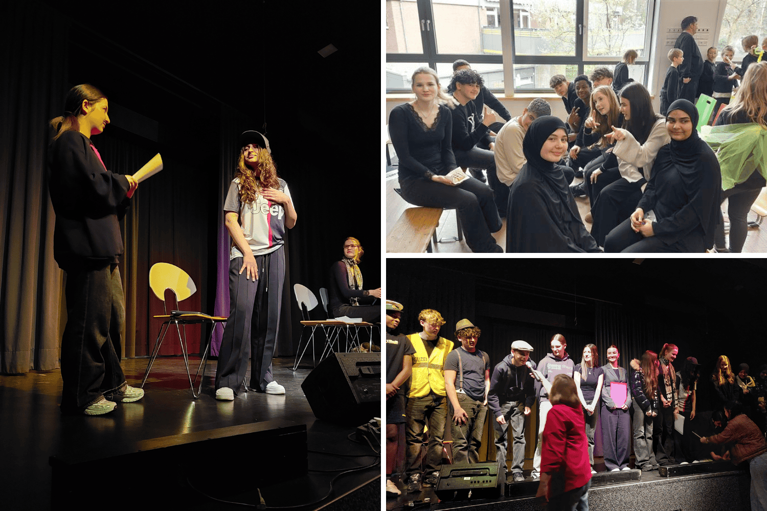 Unsere Sprechtheaterszenen waren aber ganz anders. Das Publikum hat aufmerksam zugehört und wir hatten den Eindruck, dass es vielen gefallen hat. Während der Szenen gab es viele Reaktionen im Publikum. Im Anschluss wurde viel geklatscht, was uns sehr gefreut hat. Das war ganz wunderbar. Auch nach den Szenen kamen wir mit den Schüler:innen der anderen Schulen ins Gespräch.